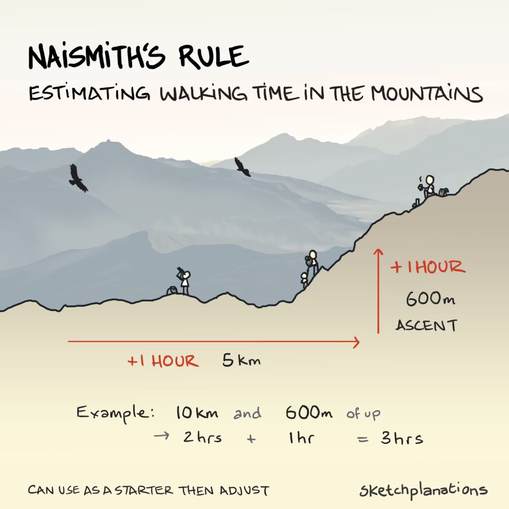 Reken voor elke 5 km (of 3 mijl) zeker een uur wandelen, plus minimaal een extra uur wandelen voor elke 600 meter (of 2.000 voet) stijging.