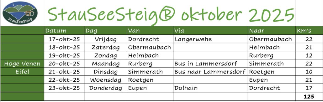 De langste etappes van onze Stauseesteig zijn zo’n 22 km, maar het kan zijn dat daar wat kilometers bijkomen vanwege de ligging van de overnachtingsplekken. Onze overnachtingen zijn dit keer in vakantiewoningen, gasthöfe en hotels. Tijdens één etappe lukte het ons niet om dichtbij het eindpunt van die dag een overnachtingsplek te vinden. Dat is de etappe van Rurberg naar Lammersdorf. Wij zullen daarom aan het eind van die dag in Lammersdorf de bus naar Simmerath nemen.