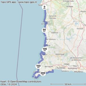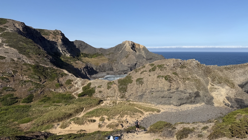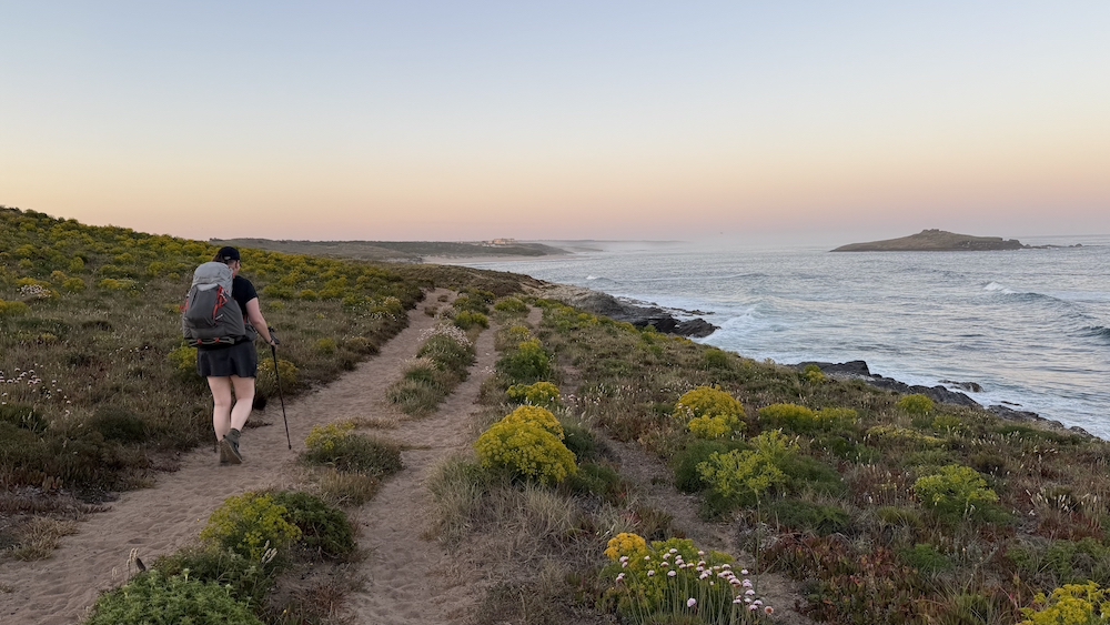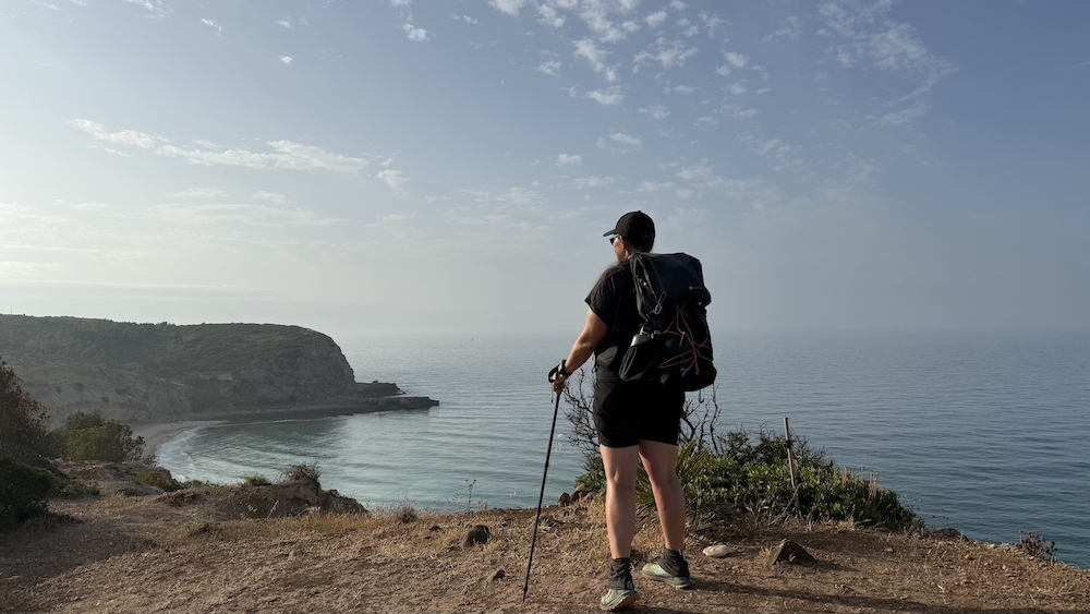 De Fishermen’s Trail is ongeveer 225 kilometer lang en volgt de spectaculaire zuidwestkust van Portugal. Kliffen, stranden, visserspaden en eindeloze oceaanzichten. Wij kozen ervoor om te starten bij São Torpes en te finishen in Lagos. Omdat we eind mei liepen — relatief laat in het seizoen — hielden we rekening met de temperatuur. We pasten onze etappes aan en planden bewust rustdagen (0-dagen) in. Zo konden we wandelen in ons eigen tempo en ook echt genieten, in plaats van alleen maar kilometers maken.