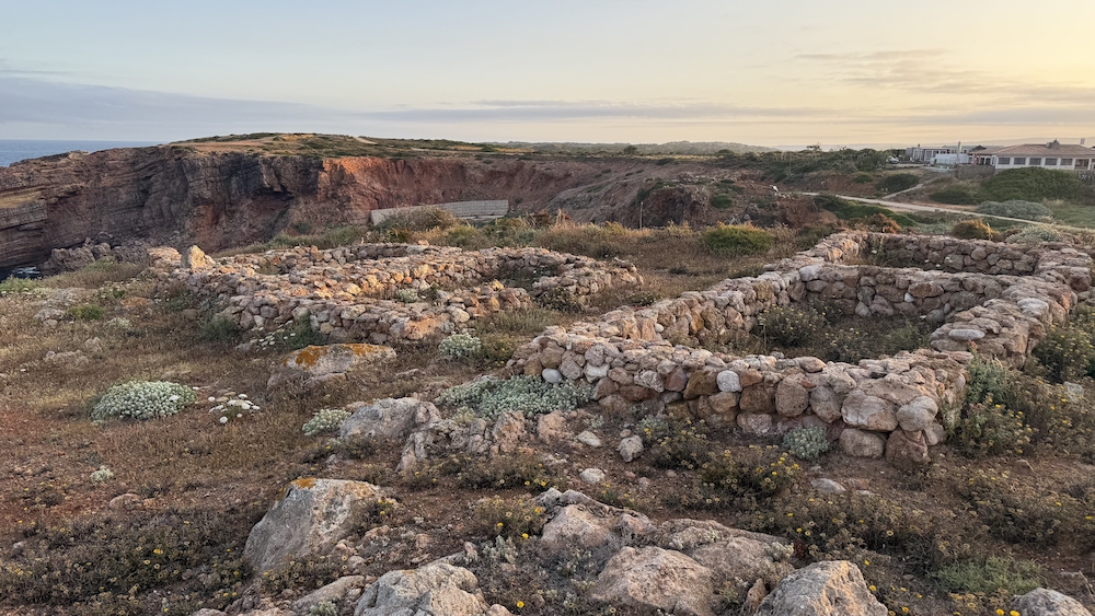Het dorp uit was al een klim, maar die klim ging verder dan alleen het dorp. Over grote keien en rode aarde. Als snel liepen we weer op de kliffen. Bij ruïnes aan het strand staken we een stroompje over en gingen we opnieuw omhoog. De paden raken door regen redelijk geërodeerd. We denken dan ook dat je hier niet zomaar bij regen kunt lopen, dan moet het erg glad zijn. Al snel kwamen we bij de resten van een oud verdedigingswerk: Forte de Almadena. Bij het afdalen liepen we Burgau binnen en kwam zwaardere bewolking opzetten. We verbaasden ons over de nieuwbouw aan deze kant van de Algarve. Ongelooflijk hoe authentiek Portugal hier verdwijnt. De Fishermens’ Trail gaat juist over de historie van die oude vissersdorpjes, maar die is hier ver te zoeken.