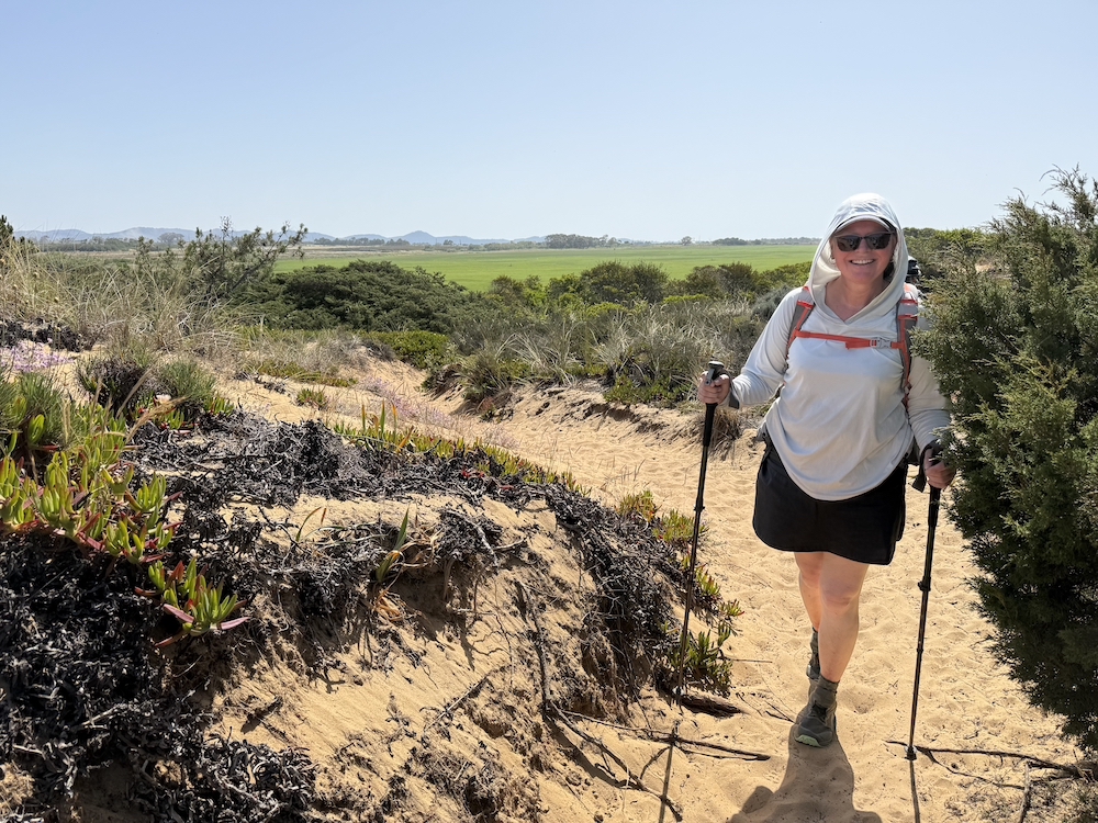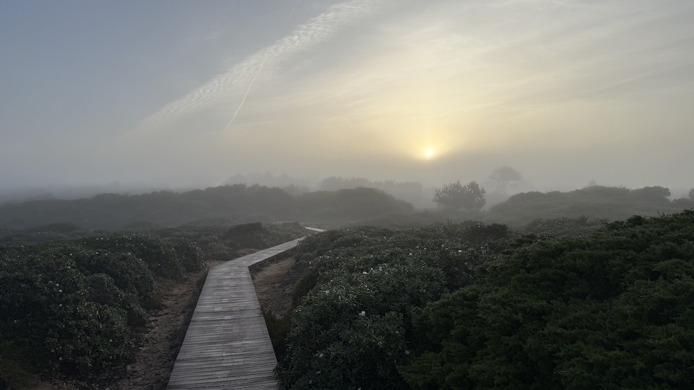 Door een enthousiast vogeltje op de waslijn werden we wakker gefloten. We vertrokken weer vroeg. Alle verhalen over deze etappe van de trail zijn op zijn minst huiveringwekkend. Zand, zand en zand. En dan van het mulle soort. Je weet wel, waar je een hekel aan hebt als je via een duin de zee wilt bereiken. Porto Covo uit begon al uitdagend met een handen en voeten-klimmetje. Gelukkig liepen we voor een groot deel in de koelte van de ochtend. En, eerlijk is eerlijk, het was een mul zandpad op de kliffen boven die mooie kust. Er was een beetje zeenevel in de ochtend. Prachtige vegetatie en bovendien genoeg kleine fauna. We zagen een hop een hagedis vangen, vlinders, zilverreigers, kleine vogeltjes, torretjes en mieren-snelwegen.