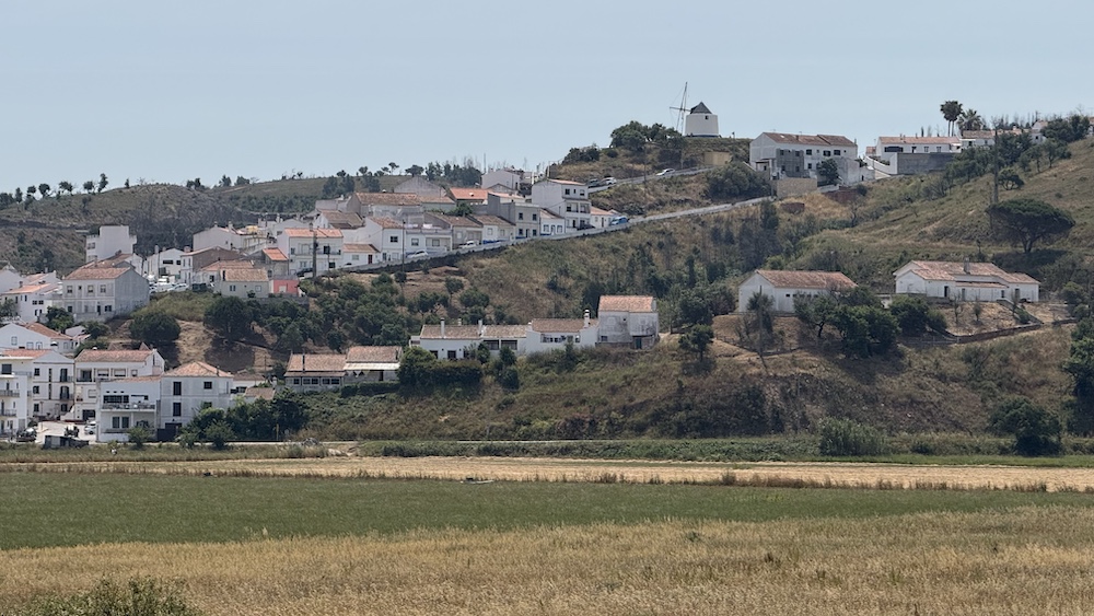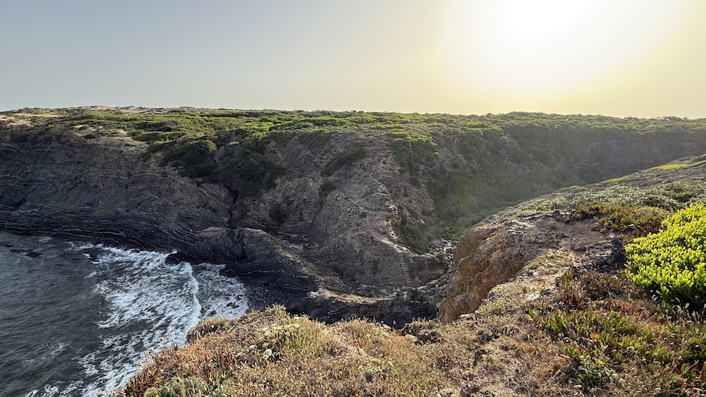 Op deze dag hadden we de keuze tussen een drukke weg en brug of een veerpontje naar de andere oever. Dat werd natuurlijk het pontje en dat kunnen we ook van harte aanbevelen. Wij waren niet de enigen die niet over de weg en brug wilden lopen. De overtocht duurde iets van 5 minuten. Maar toch leuk om zo een wandeldag te beginnen. Het eerste deel van deze dag ging door wat akkerbouwgebied, maar al snel kwamen we weer bij de kust en een deel liepen we onder de kustvegetatie door. Eenmaal weer op het zandpad aangekomen, begon het harde werken weer. Niet altijd zagen we de kust. Bovendien voelde het ietwat paradoxaal: heel erg warm, de zee onder je, maar met geen mogelijkheid de stranden op kunnen vanwege de kliffen. Tegen het middaguur bereikten we het kleine Almograve. Waar we een extra dag zijn gebleven. Even onszelf rust gunnen van het wandelen en de hitte. Wát een leven zo!