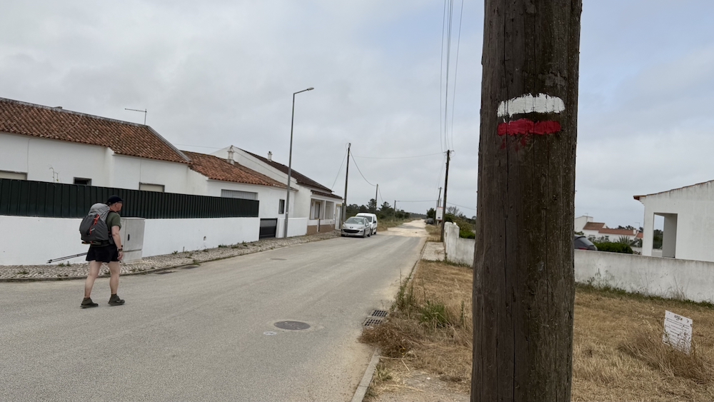 Na 3 km over asfalt liepen we weer op het mulle zand boven de kust. Deze dag was een dag die veel over wegen liep. Niet altijd asfalt, soms onverhard, maar toch een harde ondergrond. Vlak na Rogil raakten we het groen-blauwe bordje kwijt. Daar kwam wit-rood voor in de plaats. Hadden we een bord gemist? Waren we van de route af? Niet volgens de gps. We liepen nu op de E9 die het hier even over neemt. Wist je dat die van Sagres helemaal tot aan de Baltische staten loopt?! Alleen al tussen Bretagne en Kaliningrad 5000 km. Een uitdaging voor… ooit?