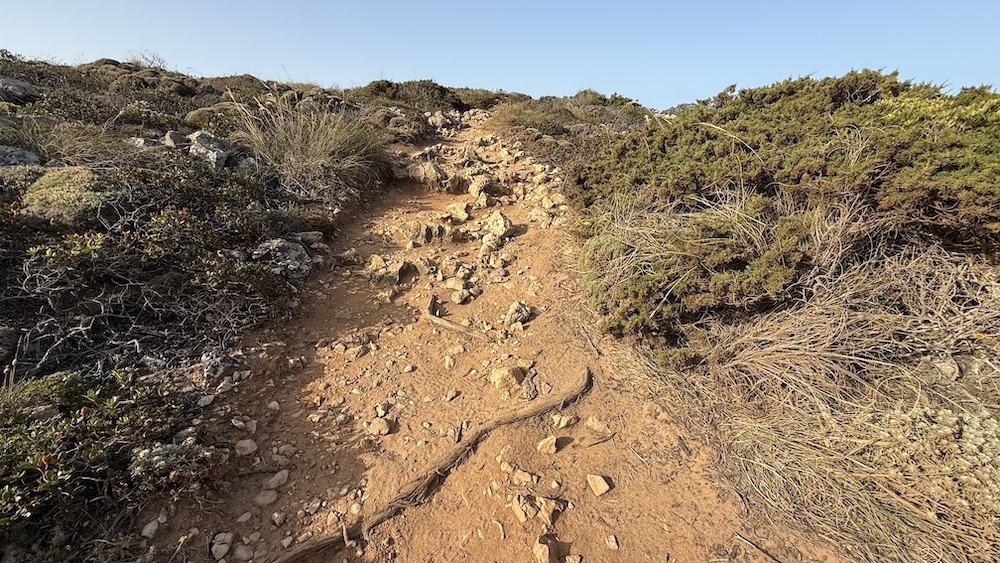 Deze etappe staat te boek als moeilijk. Wij hebben ‘m extra moeilijk, maar supergaaf gemaakt. De route voerde ons het dorp uit. Langs een historische plek waar een islamitisch vissersdorp is uitgegraven, het haventje en wat surf shacks. Vlak daarna daalden we af naar een strandje waar de wegwijzer ons de mogelijkheid bood om het pad bovenlangs te volgen òf -als de zee het toeliet- een alternatief pad te volgen via het strand. Wij kozen -uiteraard- voor het strand, de grote keien en het avontuur. Steile klimmetjes, lage bosjes en navigeren op een niet bewegwijzerd pad. Altijd leuk en veel uitdagender.