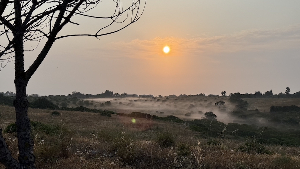 Via een klimmetje liepen we het dorp uit. Heel langzaam verdreef de zon de mist, wat mooie plaatjes opleverde. Als snel kwamen we langs een wilde dierenverzameling. Blijkbaar is er iemand hier die dat doet. Ineens was daar een gnoe (of wildebeest?) en er zouden ook zebra’s zijn. Vanwege een landgoed en een gebied met kassen moesten we een klein stukje meer het binnenland in. Een stukje over asfalt. Niet echt fijn. Terug bij de kust aangekomen waren daar weer de uitzichten en de druk bezette ooievaarsnesten. Na Azhenda do Mar vroeg het pad om iets meer toewijding: handen bij de klimmetjes, waterstroompjes passeren en door nauwe dichtbegroeide paadjes. Geen straf, want het ruikt hier door de cistus geweldig. Bij Praia Odeceixe liepen we het binnenland weer in. Daar mondt de rivier de Seixe uit in de zee. Over asfalt én een brug liepen we Odeceixe in. Deze etappe was misschien wel weer nóg mooier. Zeker avontuurlijker. We liepen de provincie Alentejo uit en de Algarve in.