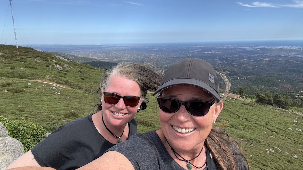 Deze kust is geweldig. Mooie doorkijkjes, oude grotten. Na bijna 4 uur (!) waren we weer terug in de haven van Ferragudo en werden we getrakteerd op koffie en koekjes, veel informatie over het waterleven én de beelden die zij hadden gemaakt. Het was S U P E R! Niet alleen het zien van de dolfijnen, ook het snelle varen was gaaf. Al met al wat later geluncht en daarna stapten we in de auto op weg naar Fóia, hoogste punt van de Monchique. Mer reed zichzelf misselijk, dat kan zij :-). We genoten desondanks van het uitzicht vanaf de top. Die top staat trouwens wel helemaal vol met (militaire) radar/ navigatie zaken.